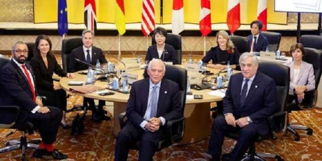 ٹوکیو – G7 ممالک کے وزرائے خارجہ نے اسرائیل اور حماس کے درمیان جاری جنگ کو انسانی بنیادوں پر ختم کرنے کی حمایت کی ہے۔ جاپان کے دارالحکومت ٹوکیو میں ہونیوالے جی7 ممالک کے وزراء خارجہ نے اجلاس کے بعد مشترکہ بیان میں کہا کہ ہم غزہ میں بگڑتے ہوئے انسانی بحران سے نمٹنے کے لیے ہنگامی کارروائی کی ضرورت پر زور دیتے ہیں۔