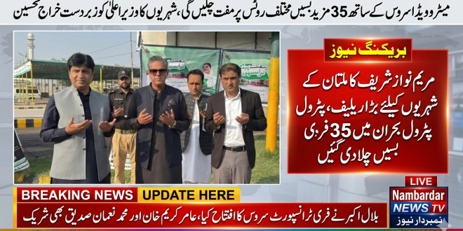 وزیر اعلیٰ پنجاب مریم نواز شریف کا ملتان کے شہریوں کو تحفہ حالیہ پٹرول کرائسس میں عوامی ریلیف کیلئے 35 فری بسیں چلادی گئیں