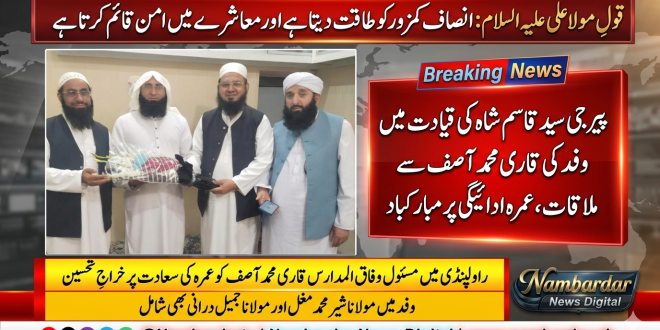 صدر علماءو مشائخ پیرجی سید قاسم شاہ اپنے وفدکے ساتھ مسئول وفاق المدارس راولپنڈی استاذالقراء قاری محمد آصف کو عمرہ کی ادائیگی پر مبارک باد پیش کرتے ہوئے اس موقع پر ممبر امن کمیٹی مولانا شیر محمد مغل اور امیر تحریک اشاعت الاسلام مولانا جمیل درانی وفد میں شامل تھے۔