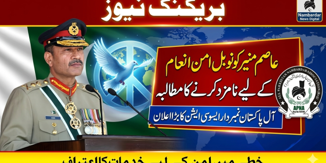 اسلام آباد – آل پاکستان نمبردار ایسوسی ایشن (رجسٹرڈ) نے چیف آف آرمی اسٹاف فیلڈ مارشل جنرل سید حافظ عاصم منیر کی خدمات کے اعتراف میں انہیں عالمی سطح پر ‘نوبل امن انعام’ کے لیے نامزد کرنے کا مطالبہ کر دیا ہے۔